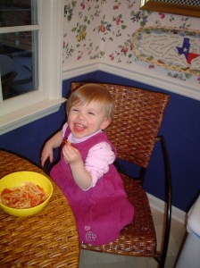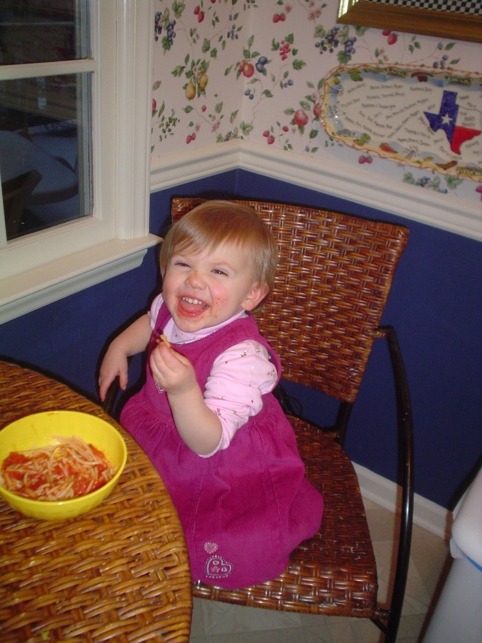 I’m pretty sure she needed to be hosed down after this meal. Spaghetti in our kitchen in Durham. Good times.
