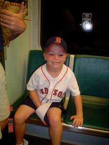 Riding the T after a game at Fenway, happy with a Fenway Frank or two in his tummy and a pennant in his hand. This boy loves baseball, and to him, baseball means the Red Sox.