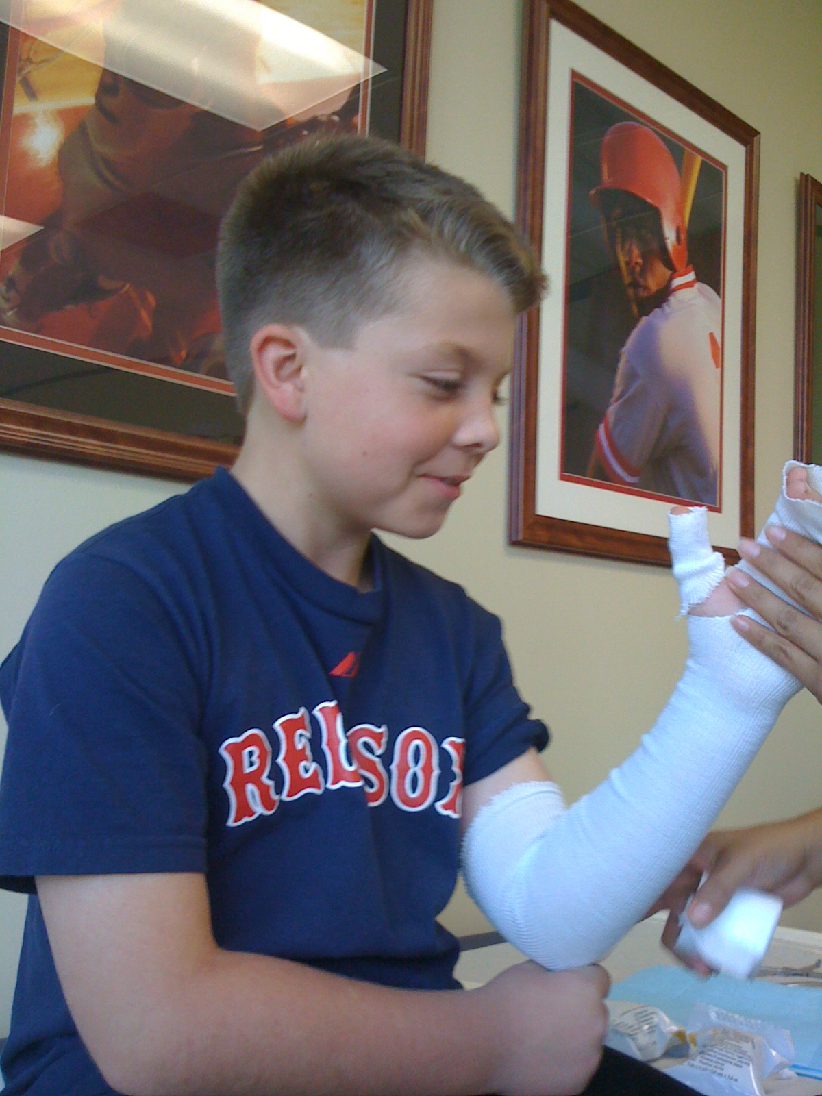When Pay broke his wrist in the 5th grade and had to get a cast, he got a red one. While wearing a Sox shirt, natch. Then he tried to scratch inside the cast with a mechanical pencil, and the eraser got stuck and he had to get another red cast. Three days after the first one. I told him that if he did it again, the third cast would be pink.
