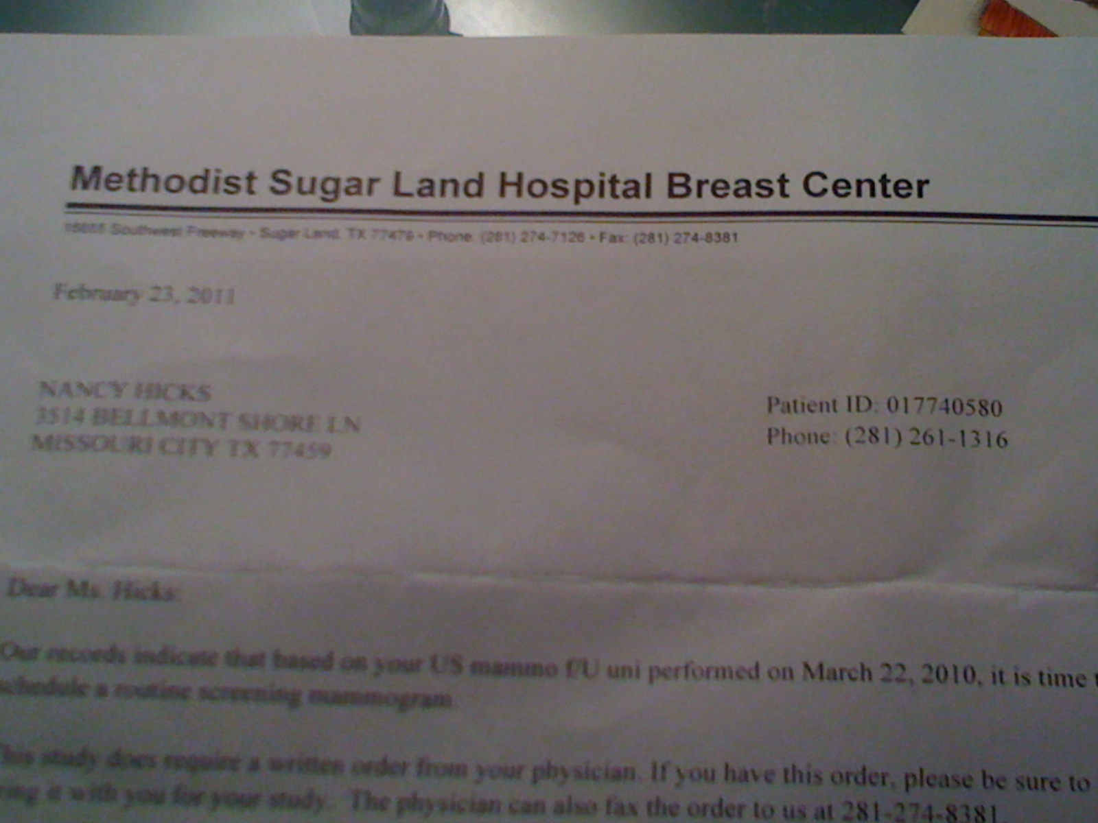 Since it’s such a shoddy photograph, let me reiterate the juicy parts: The Methodist Sugar Land Hospital Breast Center’s records indicate that based on my US mammo f/U uni performed on March 22, 2010, it is time to schedule a routine screening mammogram.
