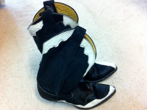 I love how there’s just enough white to set off the glossy black hide. Or hair. Or fur. Or whatever it is. Don’t tell PETA, but I love the hide/hair/fur. I’m as nutsy-kookoo for animals as always, but that poor cow was doomed anyway, so that fact that his/her hide/hair/fur ended up on a pair of boots is a part of life. If I thought for one second that that cow had a shot at living a long, bucolic life eating grass into his/her old age somewhere in the great state of Texas, I’d say thanks but no thanks on the boots. But we all know the cows around here are destined to end up on someone’s grill or smoker; this is Texas after all. Funny how I wouldn’t think of eating that cow, but wearing it doesn’t bother me one bit.